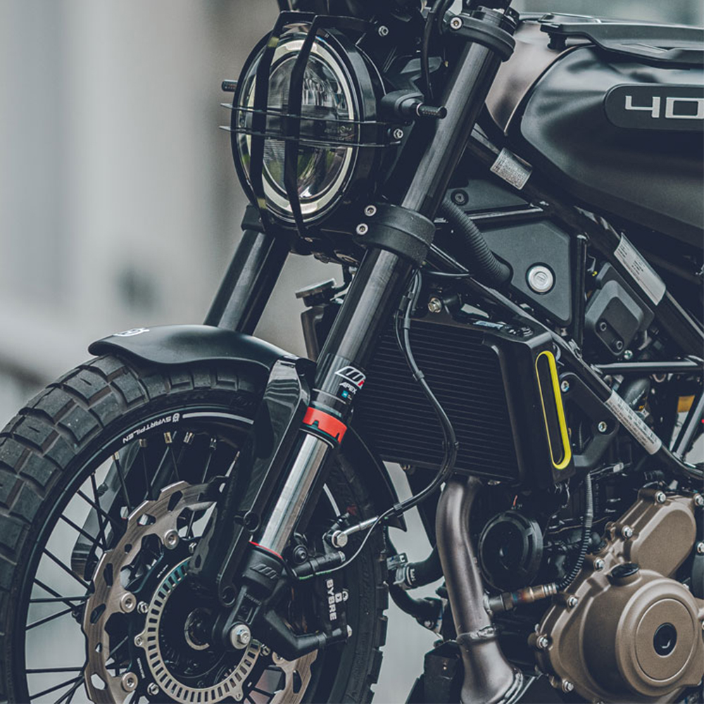 Las suspensiones WP de la Svartilen 401 cumplen con los estándares mas exigentes, asegurando el máximo nivel de calidad y de fabricación. La suspensión delantera invertida esta encomendada a una horquilla de cartucho abierto de 43mm de diámetro, mientras que en la parte trasera monta un sistema de amortiguación progresivo conectado directamente al basculante. El uso de componentes de alta calidad garantiza un comportamiento dinámico ideal para el complicado trafico urbano